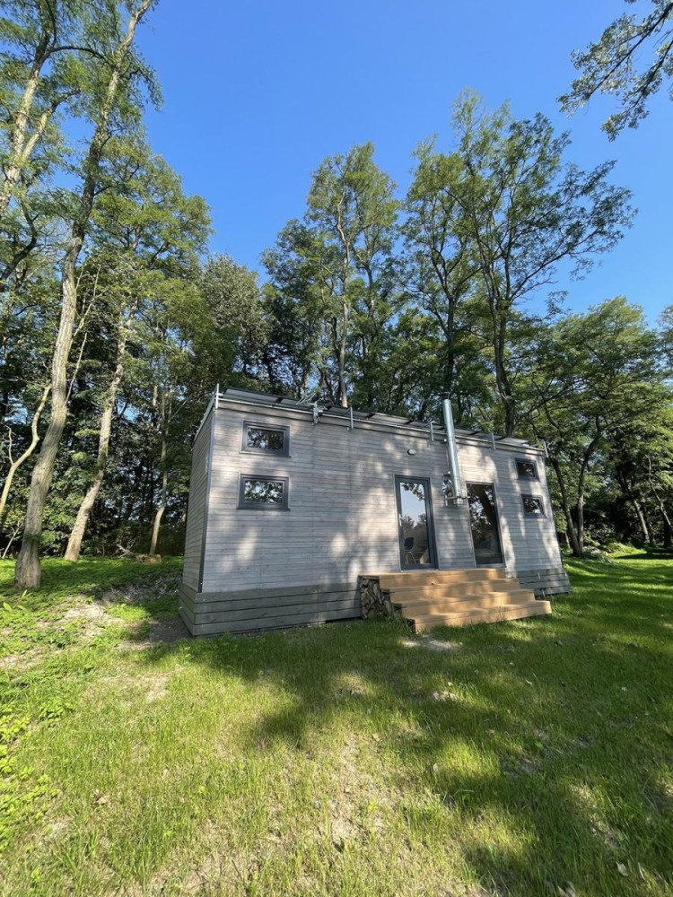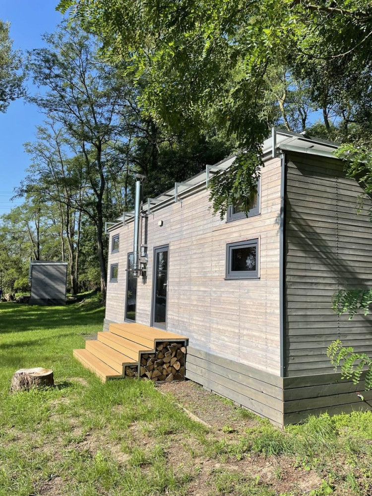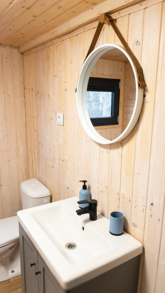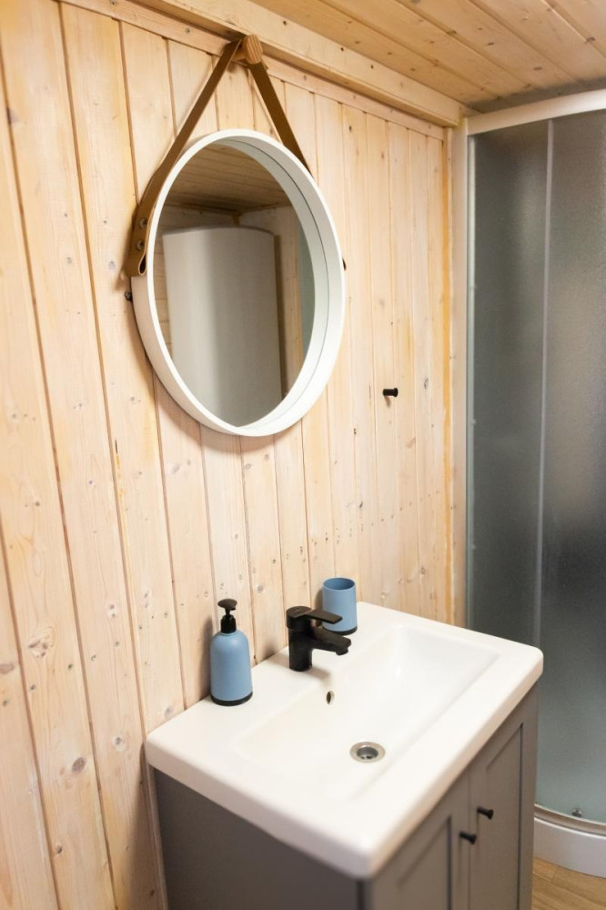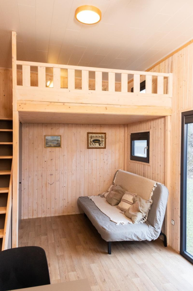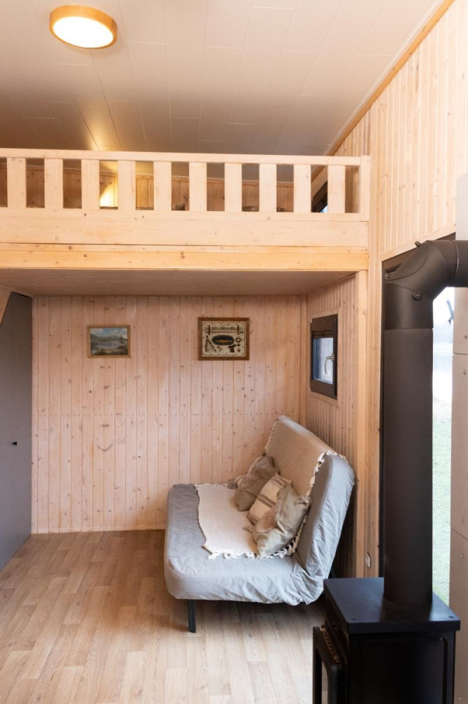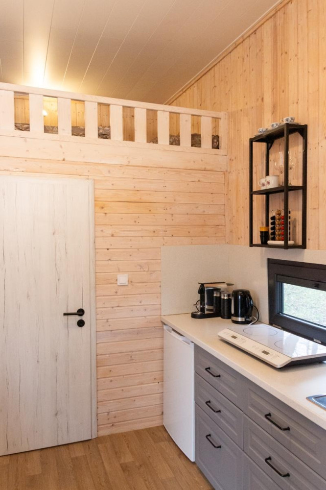 Netradiční ubytování v dřevěném mini domku (27 m²), který je pro vás komfortně zařízen. K dispozici jsou dvě patra na spaní s kapacitou pro 2 dospělé a 2 děti. Samozřejmostí je plně vybavená kuchyňská linka (lednice, mrazák, indukce) a vlastní koupelna se splachovací toaletou a sprchovým koutem. Vychovaní pejsci malých plemen (do 10 kg) jsou u nás vítáni.