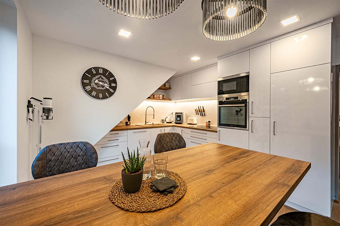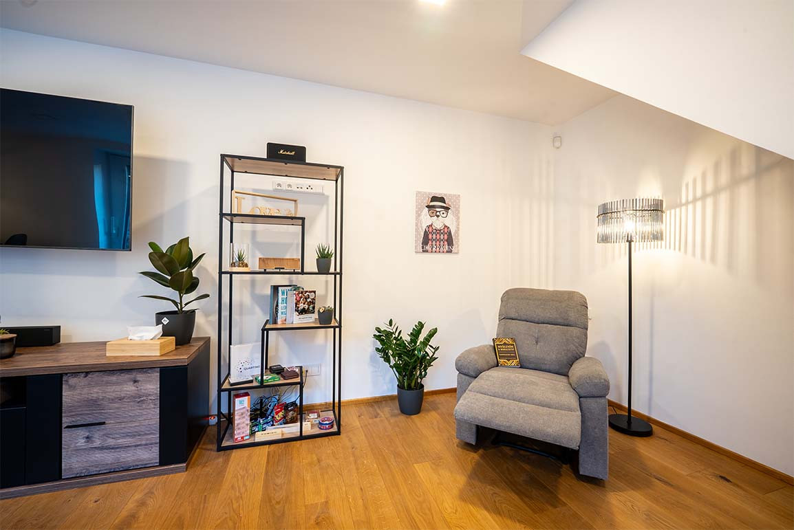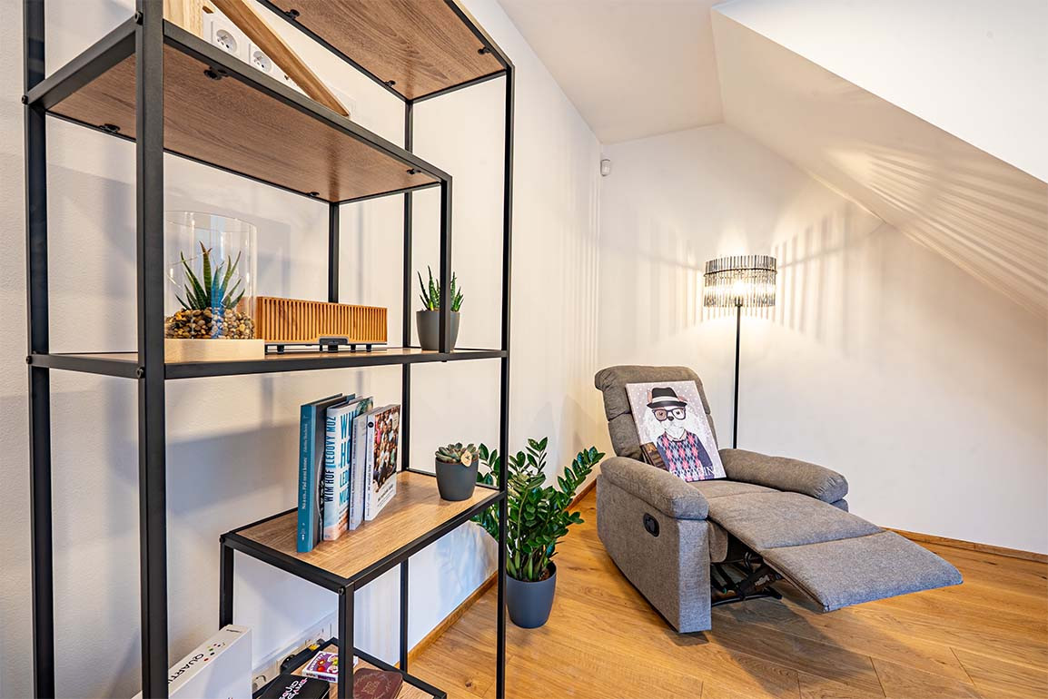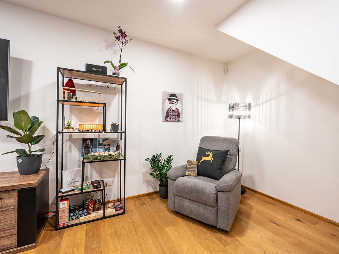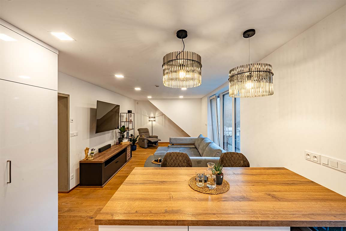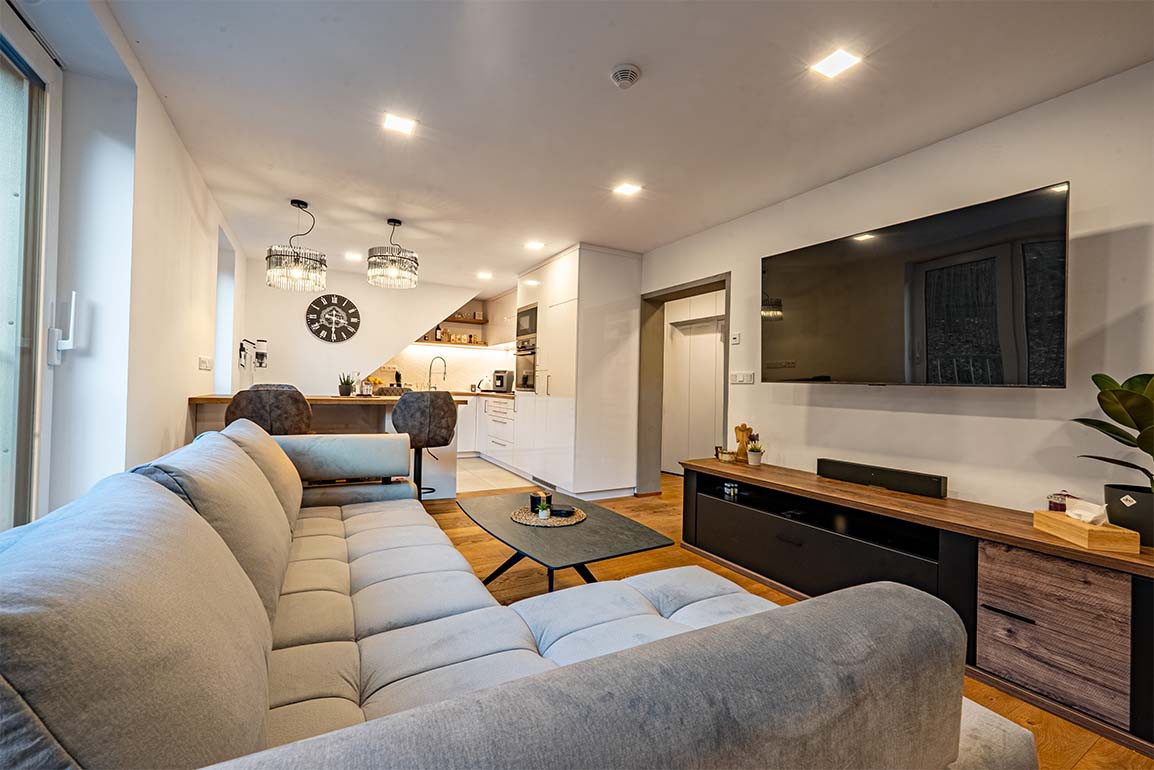 Světlý a prostorný apartmán o velikosti 64 m² nabízí samostatnou ložnici s manželskou postelí, obývací pokoj s rozkládacím gaučem, plně vybavenou kuchyň a moderní koupelnu se sprchou i vanou. K dispozici je také oddělené WC, podlahové topení a optické Wi-Fi. Součástí objektu je zahrada se saunou, altánem, otužovací káď a koupací sud. Parkování je možné přímo u domu, k dispozici je úschovna kol a lyží.